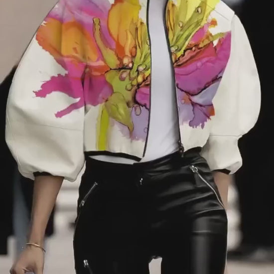 Printed Puff-Sleeve Jacket – Chic Loose Fit Outerwear