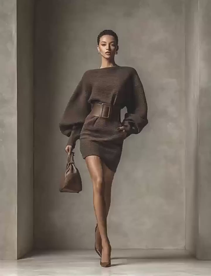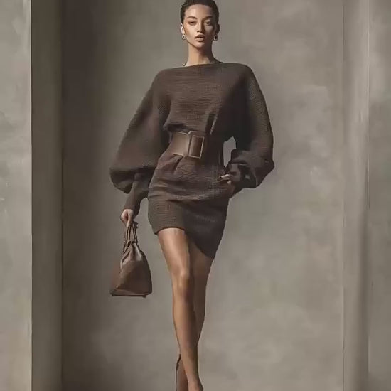 Slash-Neck Knit Mini Sweater Dress – Belted & Slim Fit